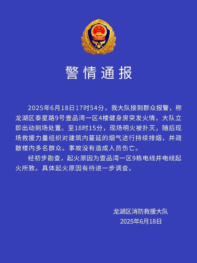 发布日期:2025-06-27 20:25 点击次数:1306月18日晚,广东汕头市龙湖区消防救援大队发布通报称,6月18日17时54分,该大队接到群众报警,称龙湖区泰星路9号壹品湾一区4楼健身房突发火情,大队立即出动到场处置。至18时15分,现场明火被扑灭,随后现场救援力量组织对建筑内蔓延的烟气进行持续排烟,并疏散楼内多名群众。事故没有造成人员伤亡。